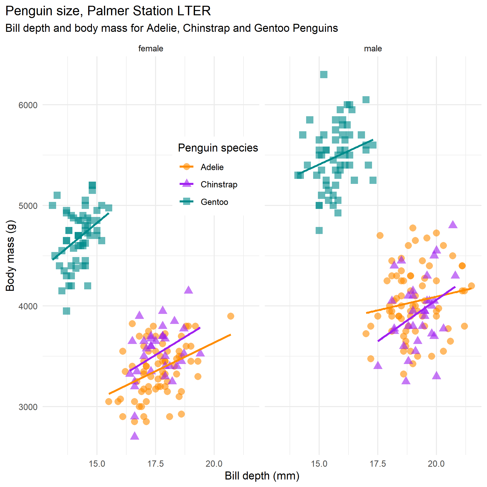 Let us recall the relationship between body mass and bill depth and have a look at the scatterplot.