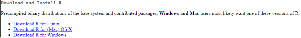 First you need to install R itself (the engine). Go to the CRAN (Collective R Archive Network)– this is the site where R itself and most R packages live. Click on “Download R for XXX”, where XXX is either Mac or Windows:
