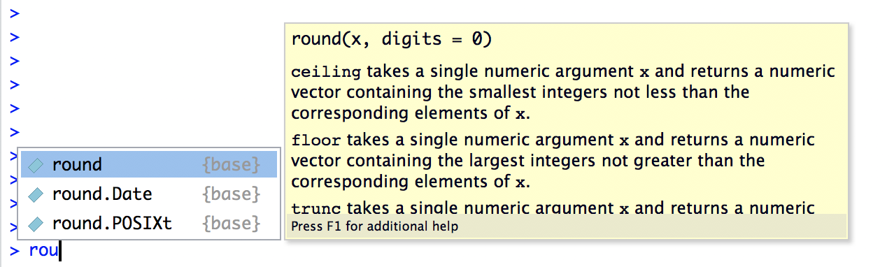 In this figure, we have typed the letters rou at the command line, and then hit tab. The window has two panels. On the left, there’s a list of variables and functions that start with the letters typed shown in black text, and some grey text that tells you where that variable/function is stored. In our case, round is included in the {base} R, what is included in every new installation of R. There’s a few options there, and the one we want is round, but if you’re typing this yourself you’ll notice that when you hit the tab key the window pops up with the top entry highlighted. You can use the up and down arrow keys to select the one that you want. Or, if none of the options look right to you, you can hit the escape key (ESC) or the left arrow key to make the window go away.