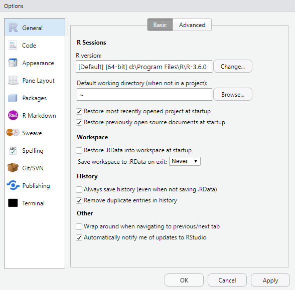- If you already installed R or RStudio for a previous course, update both to the most current version. Generally this entails downloading and installing the most recent version of both programs. When you update R, you don’t actually remove the old version - you have all versions on your computer and default to the most recent one. Sometimes this is useful when specific R libraries require an older version of R, however we will generally stick to the most recent versions of R and RStudio.