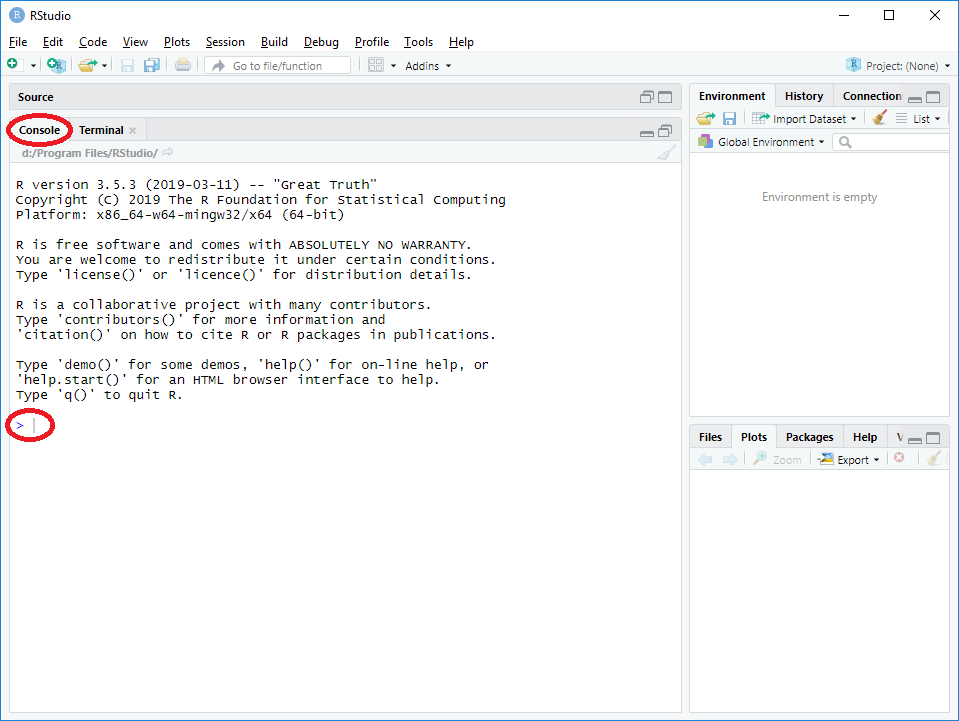 The RStudio IDE is divided into 4 separate panes (one of which is hidden for now) which all serve specific functions. The Console starts with information about the R version number, license and contributors. The last line is a standard prompt > that indicates R is ready and expecting instructions to do something.