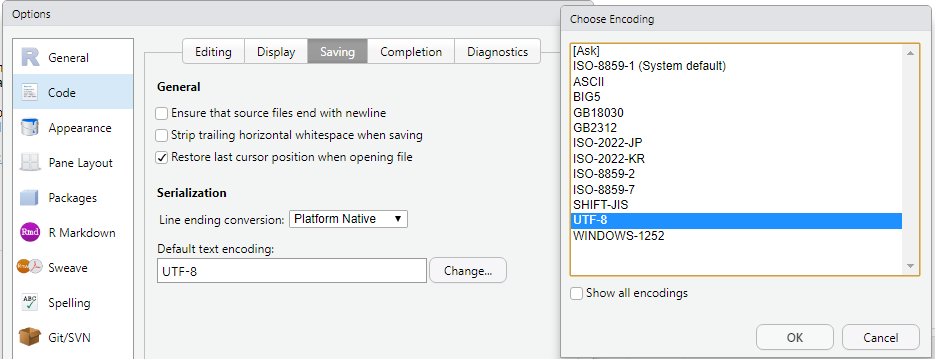 UTF-8 is the best possible character encoding, it works everywhere and we shall ask R Studio to use UTF-8 encoding globally. Please go to Tools… Global Options… Code… Saving and and change the default text encoding to UTF-8 as shown below:
