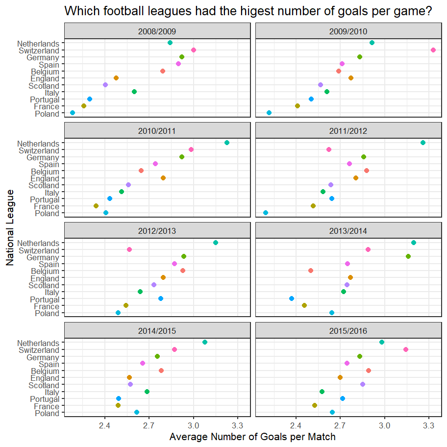 The resulting dataframe only has the information we want: 4 variables (columns) and 88 rows (cases); for each country and season, we have the average number of goals scored per match. We can now use this smaller dataframe and plot the results.